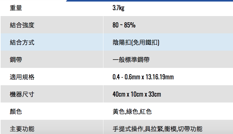 免扣钢带打包机一般适用于平面包装,例如箱体、栈板和其他各式类似的包装形式,免扣钢带打包机不需要使用另外的钢扣;其特点主要在于免扣连接的平均抗拉强度约为钢带抗拉强度的80%,十分可靠,并且可以节约大约10%的整体包装成本。应用于几乎所有领域的通用型钢带打包工具,使用可靠,设计坚固,易于操作并且较为轻便。